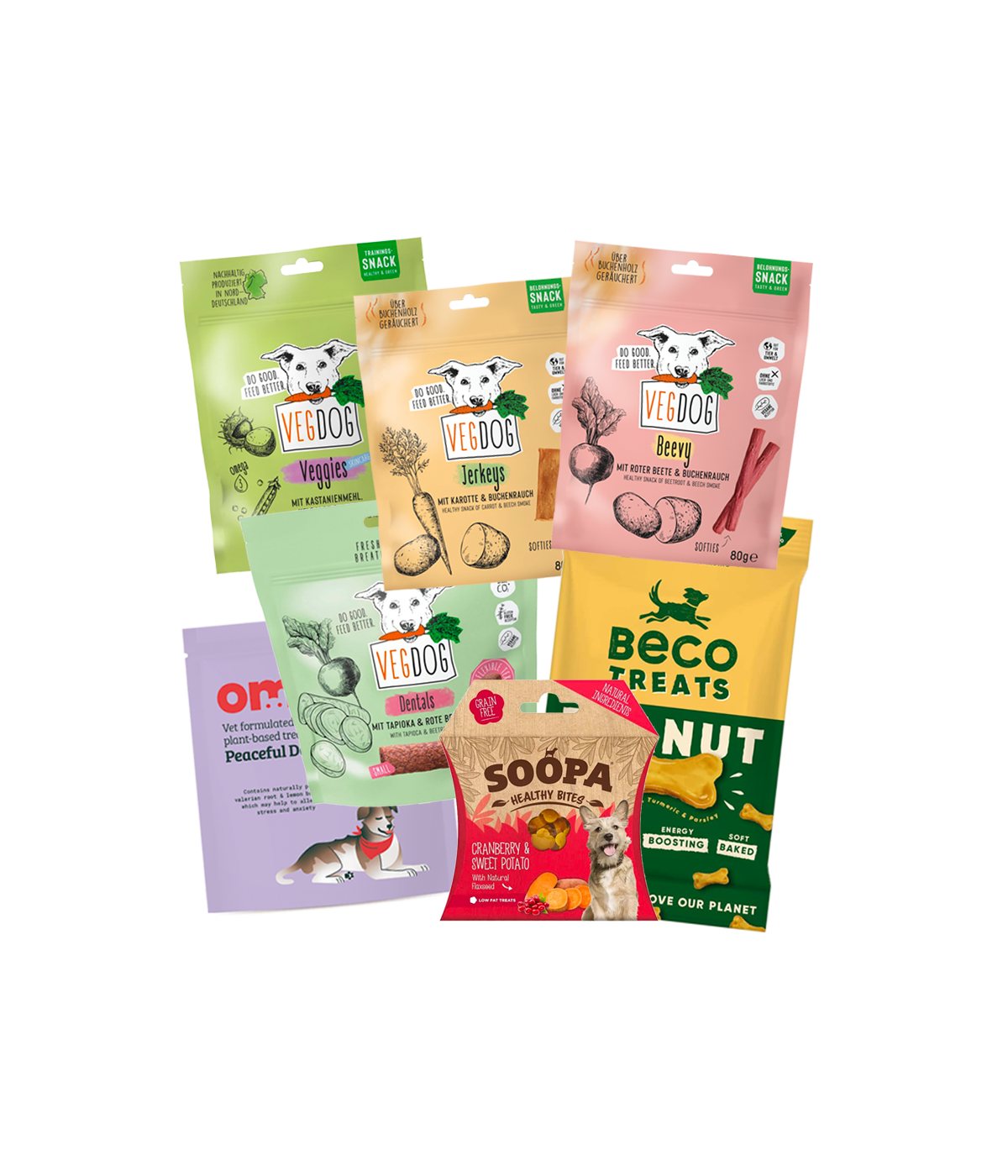 Alle producten in dit pakket zijn vegan. Hoe fijn is het om je hond te verwennen met een diervriendelijke snack?!